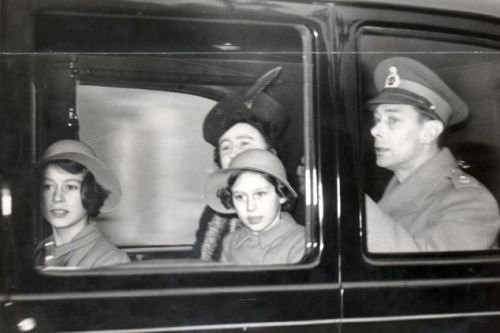 King George VI and his family leave Buckingham Palace, 1939, to spend Christmas at their country house at Sandringham. Pictured are the King and his wife Queen Elizabeth, daughters Princesses Elizabeth and Margaret Rose. Princess Elizabeth would become Queen Elizabeth upon the death of her father in 1952.