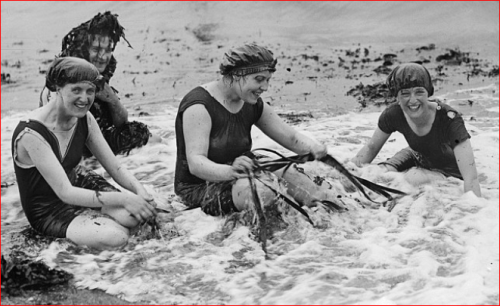 Wearing modern one-piece suits inspired by swimmer Annette Kellerman, women bathers gather seaweed and laugh. Aberystwyth, Cardiganshire in Wales, 1916