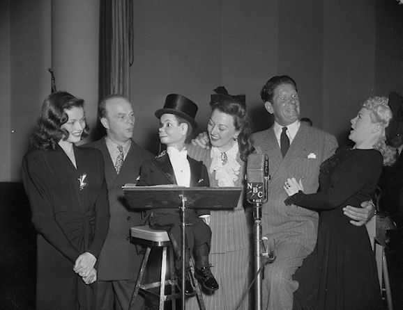 Gene Tierney (far left) inaugurates a shortwave radio program for military service people.August, 1942