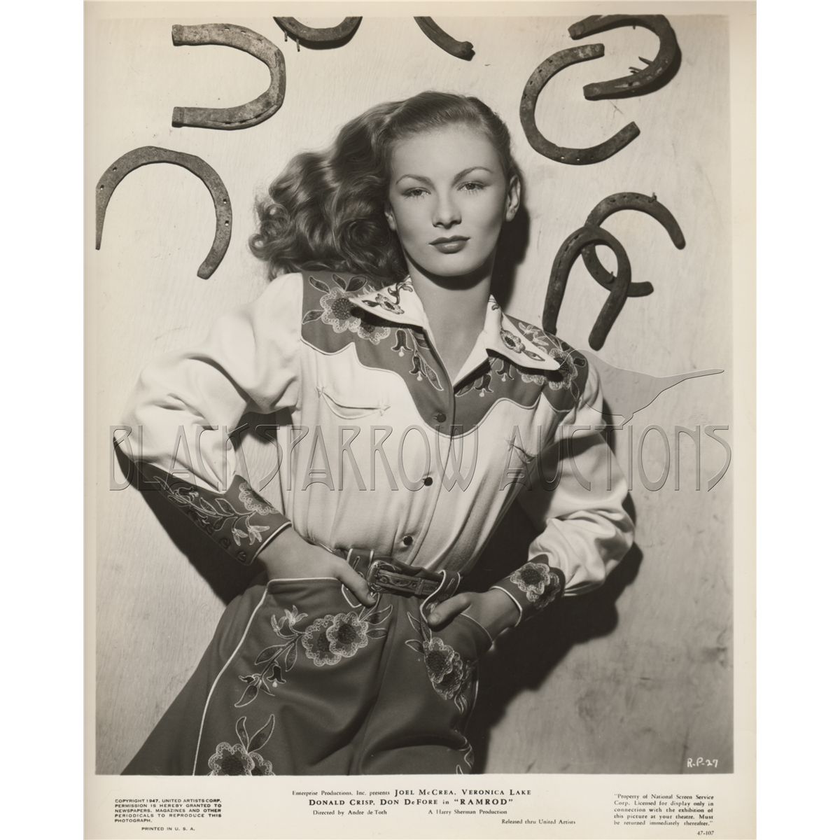 In Ramrod (1947), Veronica Lake is still identified with her trademark long and loose tresses although both eyes are visible here.