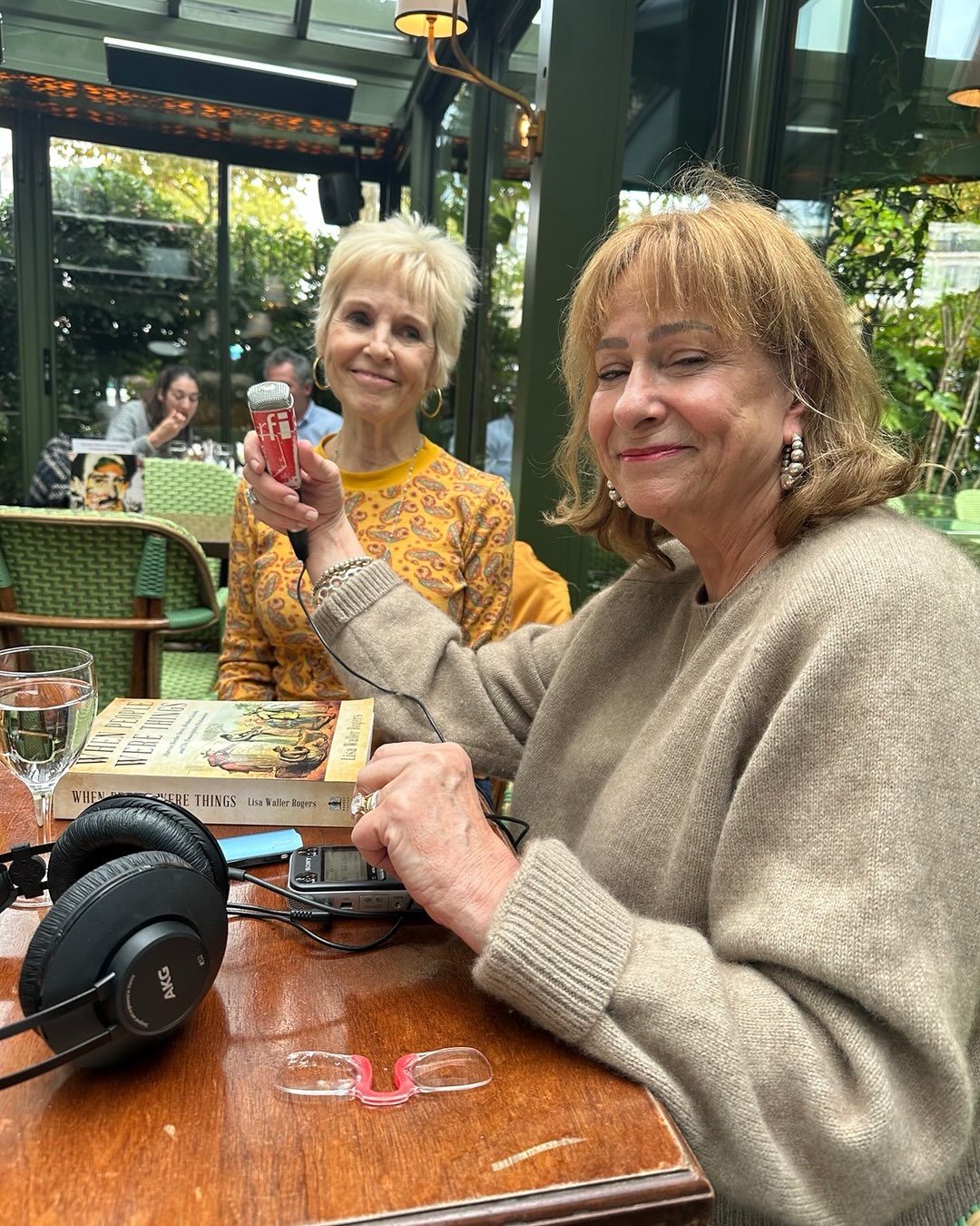 Susan Owensby, the Sound Kitchen, interviewing the author, Lisa Waller Rogers, at Les Closerie des Lilas, Paris.
