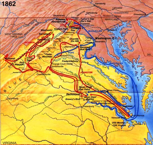 Although this map shows a lot of info, you can pick out Fort Monroe, Washington, D.C., the Potomac River, Richmond, and Norfolk, Va. The Confederate and Union capitals were only about 100 miles apart.
