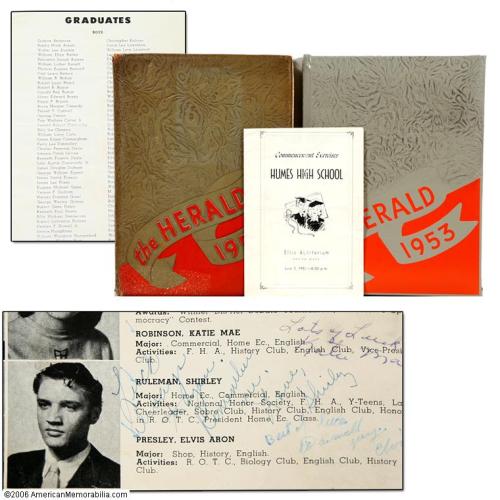 Elvis worked as an usher at the Suzore #2 Movie Theatre which let him watch a lot of shoes. In his 1953 Hume High School senior picture, you can see that Elvis has put a permanent wave in his hair. He was copying Tony Curtis, who was the biggest star of his day. He had just completed the mega-hit, “Houdini.”