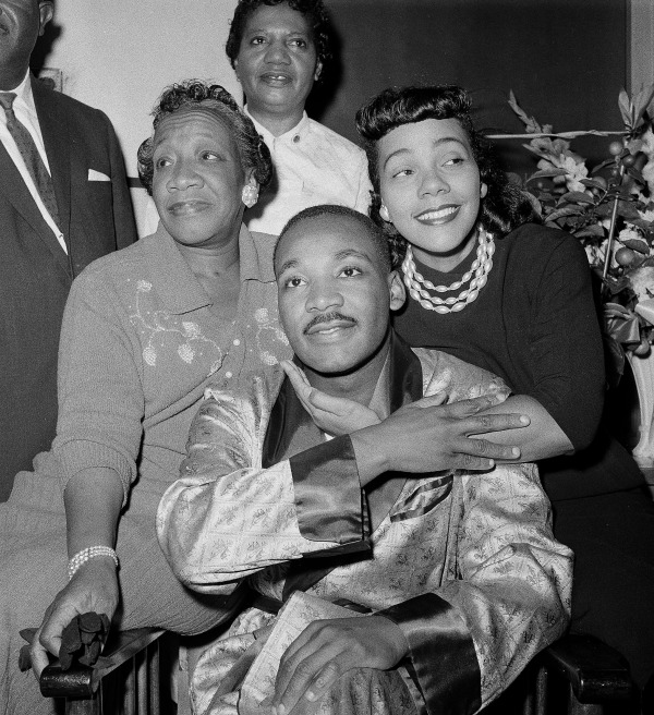Dr. Martin Luther King, Jr., is embraced by his wife Coretta Scott King during a news conference at Harlem Hospital in New York, Sept 30, 1958, where he is recovering from a stab wound following an attack by a woman. At left is his mother, Alberta Williams King. (AP Photo/Tony Camerano)