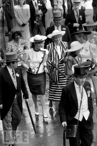 Sarah Ferguson, the Duchess of York (l), and Princess Diana (r) attend the Royal Ascot, June 1987.