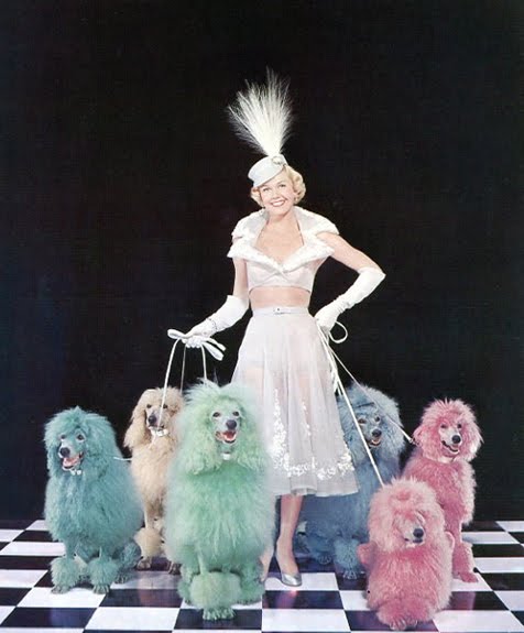 Then the poodle enthusiasts went a step further. They attempted to make an animal that was already cute even cuter. They began to use vegetable dyes to dye the dogs to match their owners’ houses, moods, and outfits. Movie actress Doris Day epitomized this fad when she appeared in the movie, “April in Paris,” with six dyed poodles on leashes.