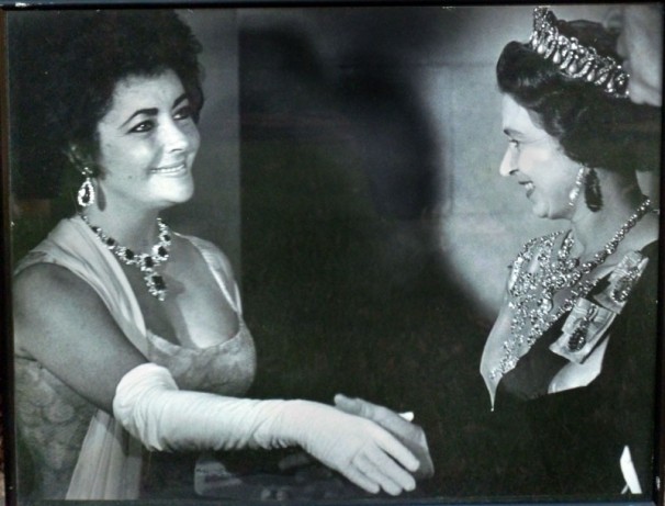 At a British Embassy reception, Queen Elizabeth II of England gets a look at Elizabeth Taylor’s famous jewels: the Bulgari Grand Duchess Vladimir Suite of emeralds and diamonds from her soon-to-be-ex-husband, Richard Burton. July 1976