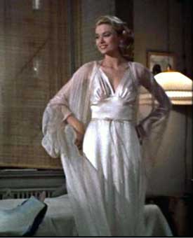 Grace Kelly wears a silky negligee in a movie still from the 1954 murder-mystery, “Rear Window.” Costume designer Edith Head recalled Kelly giggling upon spotting her reflection in the mirror. “Why, I look like a peach parfait!” she said.