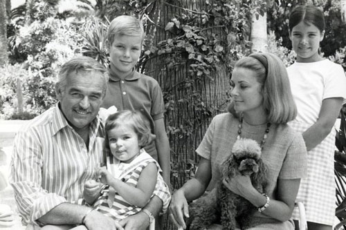 The Grimaldis smile for the camera: Prince Rainier holds Princess Stephanie with blue-eyed Prince Albert looking on from behind. Dark-haired beauty Princess Caroline flanks her mother, Princess Grace on our right. photo ca. 1967.
