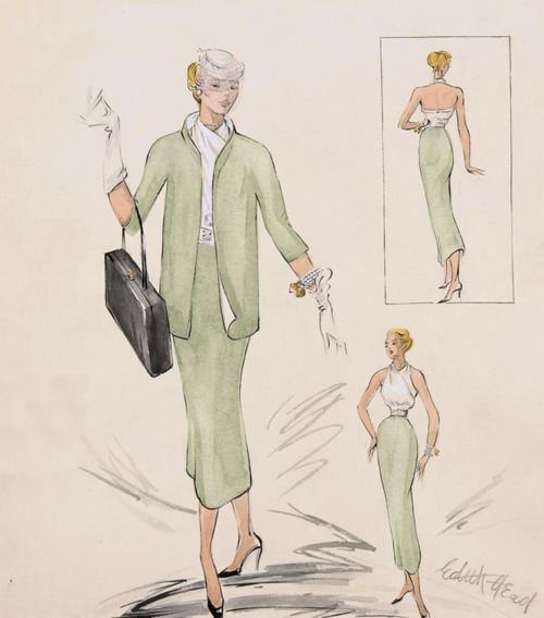 Some accounts say that Edith actually erased her friends’ names from their sketches and substituted her own. That next day, she appeared at the studio for her interview, a portfolio of other people’s work in hand. Howard Greer, head of the studio wardrobe department, described the interview in his memoirs: