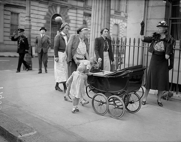 May 1940, London. Elizabeth Van Swinderen, wife of the former Dutch minister to Great Britain, points out London barrage balloons to Princess Juliana of the Netherlands, who is pushing the stroller. Juliana is with her children, Beatrix is by her side and Irene is in the baby carriage.