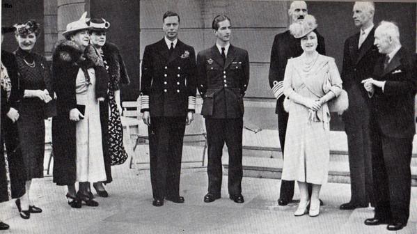 The Exiled Royals with the King and Queen of England, WWII (photo undated). From left to right: Queen Marie of Yugoslavia,Miss Benesj,Queen Wilhelmina of the Netherlands,Miss Raczkiewicz,King George VI of England,King Peter of Yugoslavia,King Haakon of Norway, Queen Elizabeth (The Queen mother) of England, the President of Poland, M. Raczkiewicz and Dr. Benesj, President of Tsjecho- Slovakia.